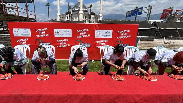 Antalya'da kadınlar domates yeme ve kasa taşıma yarışmasında mücadele etti
