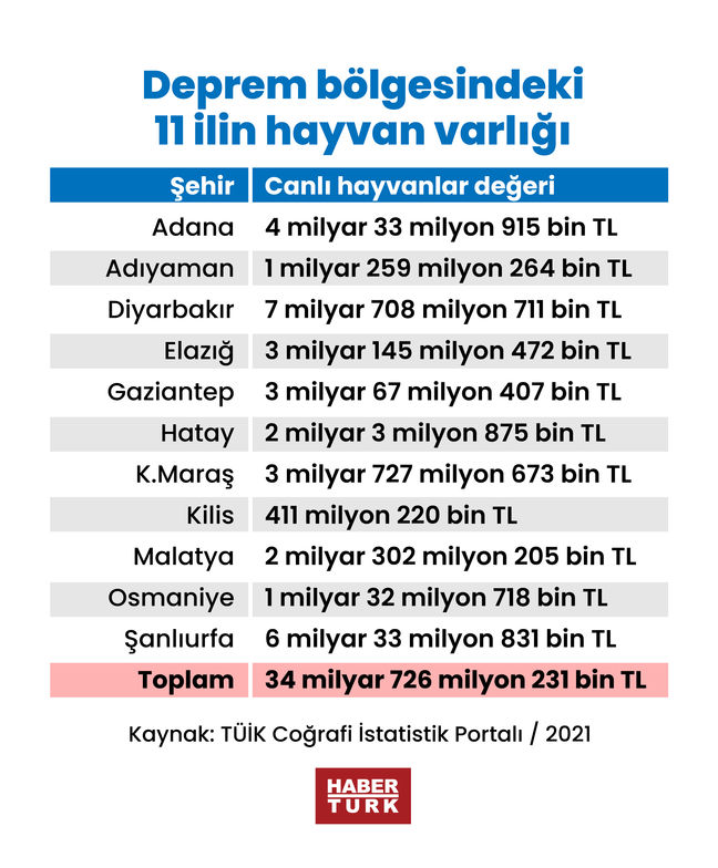 TÜİK'in Coğrafi İstatistik Portalı'nda yer alan 2021 tarihli verilere göre; 11 ilde bulunan toplam canlı hayvan değeri ise 34 milyar 726 milyon 231 bin TL.