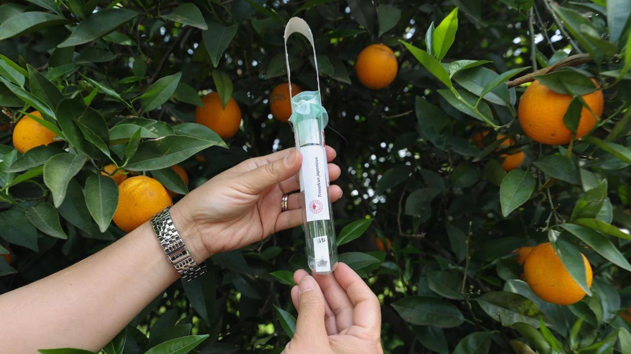 İl Tarım ve Orman Müdürü Şakir Fırat Erkal, BATEM Müdürü Abdullah Ünlü, bazı okullardan tarım alanında eğitim alan öğrenciler ile ziraat mühendisleri narenciye ağaçlarına "Trissolcus Japonicus" adı verilen faydalı böcekleri saldı.
