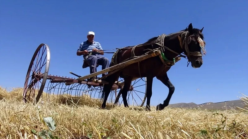 Bir yanda modern biçerdöver ve traktörlerle tarlalarda hasat yapılırken, diğer yanda bazı çiftçiler geleneksel yöntemlerde kullanılan at tırmığı gibi tarım aletlerini tercih ediyor.