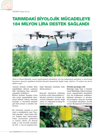 korunması amacıyla uygulanan biyolojik mücadele kapsamında bugüne kadar çiftçilere 184 milyon lira destek