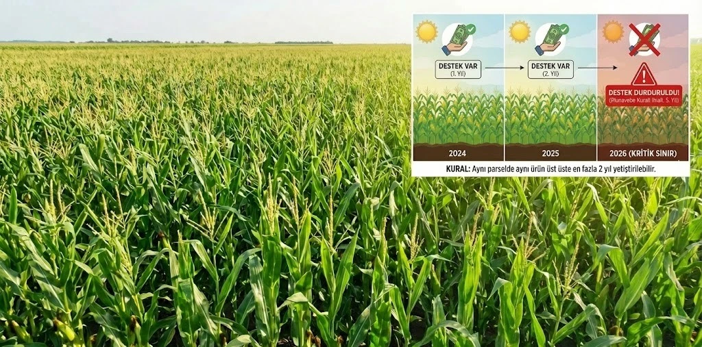 Bakanlığın yeni destekleme stratejisine göre, bir parselde aynı ürün üst üste 2 yıldan fazla yetiştirilemez. Eğer tarlanıza 2024 ve 2025 yıllarında aynı ürünü (örneğin mısır veya buğday) ektiyseniz, 2026 yılında üçüncü kez aynı ürünü tercih etmeniz durumunda sistem otomatik olarak desteklemeyi durdurur.