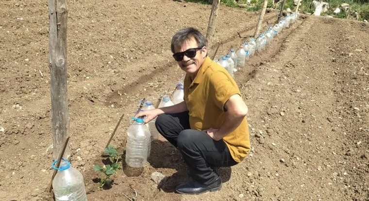 Kütahya'nın Hisarcık ilçesinde çiftçilik yapan Sadettin Gün, tarlasına ektiği sebze fidelerinin üzerini, erken ürün elde etmek ve zirai dondan korumak amacıyla pet şişelerle kapatma yöntemini geliştirdi.