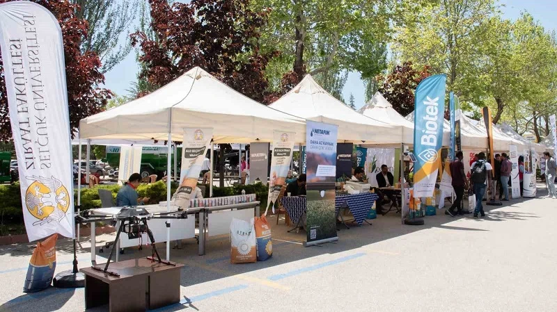 Selçuk Üniversitesinde Ziraat Fakültesi önünde düzenlenen festivalde, kamu kuruluşları ile özel firmaların stantlarında tarım sektörüne yön veren yeni dijital gelişmeler ve araçlar tanıtılıyor.
